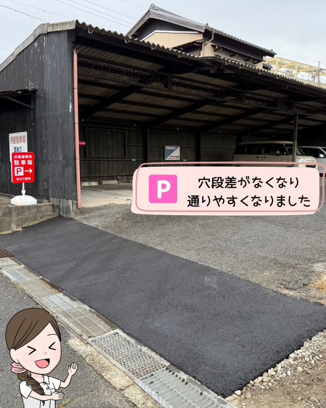 このたび、駐車場入口の穴と段差の補修工事を行い、車の出入りがスムーズで通りやすくなり、安心してご来院いただけるようになりました