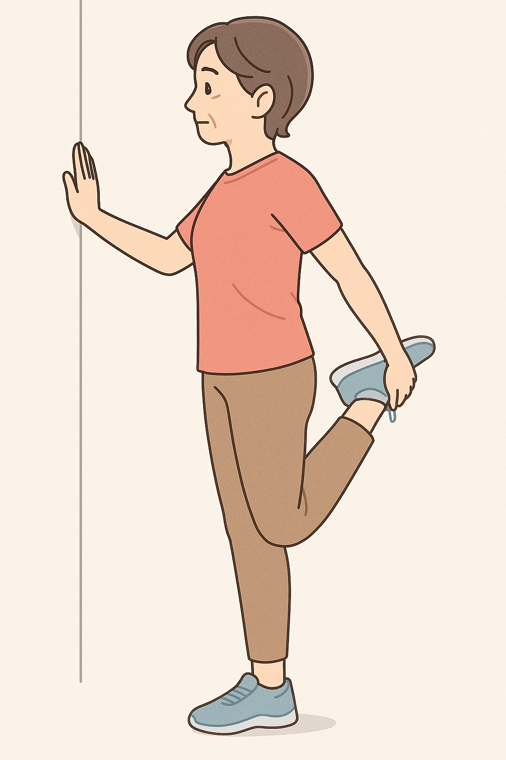 壁や椅子に手をついて立ち、片足首を後ろから持ちます。